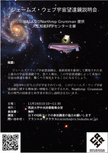 ジェイムズ・ウェッブ宇宙望遠鏡に関する講演会を以下のとおり開催します。 場所:筑波大学 つくばキャンパス 中央図書館 集会室日時:11月16日10:10〜11:30参加費:無料 詳細: